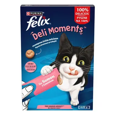 Zahvaljujući neodoljivom okusu i gustoj, glatkoj teksturi NOVIH FELIX® Deli Moments™ poslastica, vaša će mačka uživati u obroku i duže vam biti blizu.